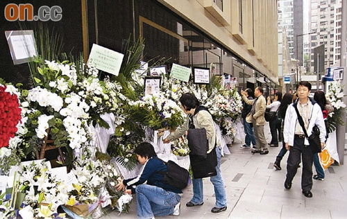 虽然哥哥离开了6年,但时间并不能洗去歌迷对他的思念,昨午,一个接一个漂亮花圈送到文华酒店门侧,代表来自香港、台湾、美国、加拿大、日本和上海的歌迷悼念一代偶像,连外籍人士都被吸引停下脚步拍照留念。