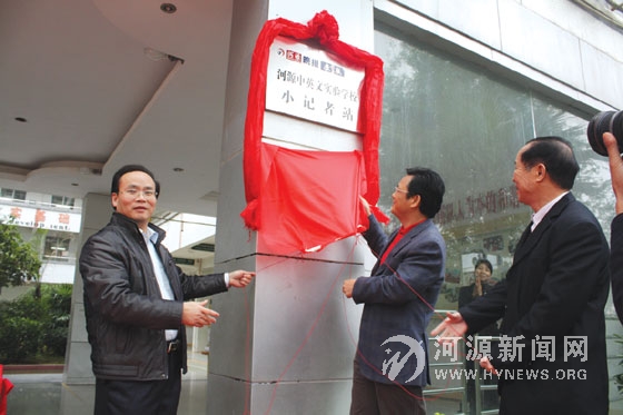 3月8日,“河源晚报小记者部暨小记者站授牌仪式”在河源中英文实验小学举行。市教育局、河源晚报社及市直、源城区7所中小学校的领导和小记者代表参加了仪式。图为市教育局副局长陈俊荡(左)、河源晚报社总编辑梁伟光(中)、河源中英文实验学校校长黄钦仁(右)为《河源晚报》河源中英文实验学校小记者站揭牌。
