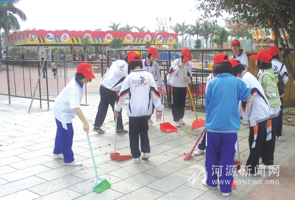 去年底,我市创建“国家卫生城市”顺利通过了省考核。为接受全国爱卫会的考核,使创卫工作取得成功,市区各学校纷纷行动起来,为创卫工作加油出力。图为3月21日,市一中学生自觉带上劳动工具到河源文化广场打扫卫生。