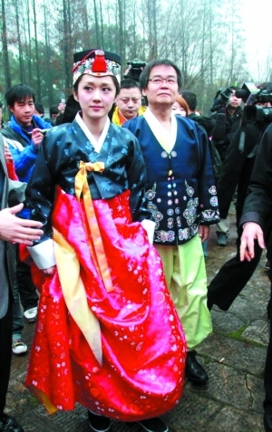 张娜拉跪拜时,助理帮她提裙。