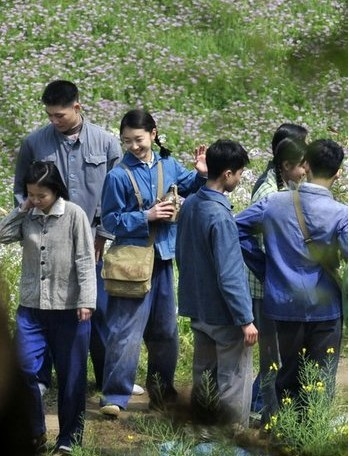 第一场知青进乡戏拍摄结束,女一号(右)和年轻演员们合影留念后打招呼离开