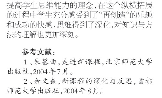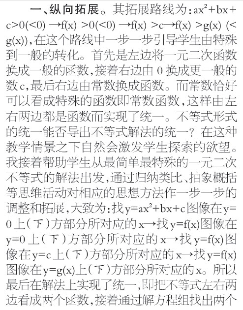 [摘要]数学学习和研究从不满足于特殊情况的结果,而是通过归纳、类比等方法探索,研究各种对象的一般规律,寻求解决问题的一般方法。数学学习和研究也从不满足于局部范围的统一,而是通过拓展原来的概念和理论去寻求更大范围的统一,发展和构建新的结果和理论。因而我们在课堂教学上应充分创设纵横拓展的教学情景,引导学生通过观察发现、归纳类比、抽象概括等思维活动寻求解决问题的一般方法。