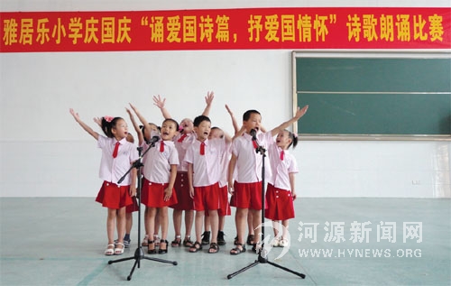 为庆祝新中国62 岁生日,讴歌祖国的辉煌历史和灿烂文化,体现学生们热爱祖国的真挚情怀,国庆前夕,雅居乐小学举行了 “诵爱国诗篇,抒爱国情怀”诗歌朗诵比赛。小选手们用稚嫩的童声和真挚的情感歌颂伟大祖国的壮丽山川和辉煌历史,表达了对祖国母亲的美好祝愿。