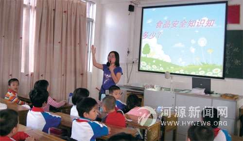 老师在教给学生们食品安全知识。近日,市二小各中队开展了一次以“食品安全,关系你我他”为主题的队会活动。各中队活动丰富多彩,通过朗诵、合唱、表演等形式宣传食品安全知识。
