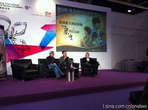 《建党伟业》导演黄建新(中)在香港国际影视展新浪潮论坛上否认“汤唯在片中戏份被全剪”的传闻