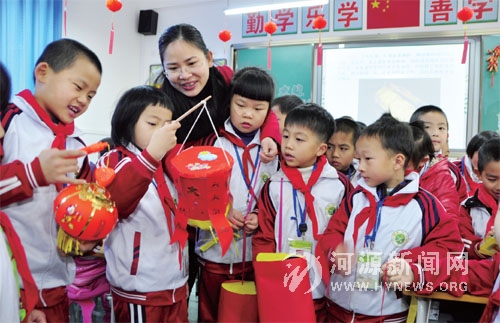 雅居乐小学的老师在给学生讲解客家花灯的民俗知识。新学期开学,源城区雅居乐小学给学生们上了一堂别开生面的课:将春节客家民俗搬进课堂,让青少年了解和掌握传统的客家文化知识。客家拜年、吊花灯等民俗活动成为该校学生新学期的第一课,受到了学生们的热烈欢迎。