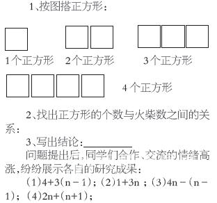 例2、如教《用字母表示数》一课时,笔者是用火柴棒搭正方形游戏来创设情景。同学们按要求以组为单位搭正方形,然后讨论搭出n个正方形时,需用火柴多少根?
