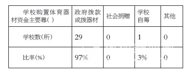 从表3 可看出,学校购置体育器材资金主要靠政府拨款或拨给器材的学校有29 所,占 97%,而主要靠学校自筹的只有1 所,占3%。政府拨给的器材比较单一,而且数量较少,大部分学校只有几个篮球和田径常用的器材等。总体上看,农村中小学体育经费紧张是突出问题。有93%的学校认为,体育经费是制约农村学校体育的主要原因之一。