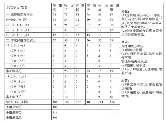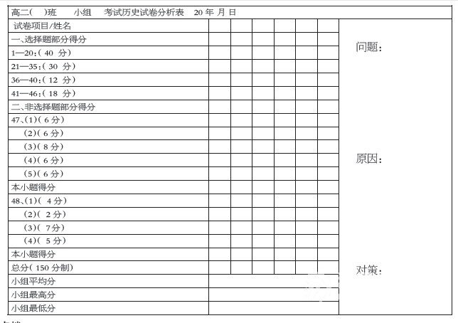 (3)向各个学习小组发放试卷分析表(分析表如下),每个学生把自己的答题情况(每题得分、对错率、原因分析、改正对策)汇报到本学习小组组长处,小组长负责把本组情况汇总并填写到试卷分析表,然后上交给科任老师。例:历史试卷分析表