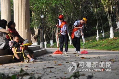 学生志愿者们在茶山公园打扫卫生。