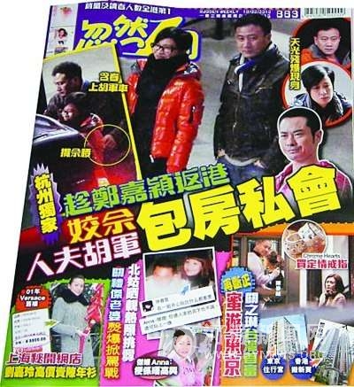 《忽然一周》周刊最新一期的爆料称在杭州独家拍到佘诗曼趁郑嘉颖返港,与胡军包房私会,杂志的封面是偷拍到的佘诗曼与胡军两人路上边走边说笑的照片,另一张则是佘诗曼上车,胡军很绅士地开车门并轻扶佘诗曼。周刊称佘诗曼含春上胡军车,而胡军揽佘诗曼的腰。佘诗曼看到此八卦后十分愤怒,昨天18点57分在其微博中怒斥周刊不实报道,“八卦杂志又有不实报道!真係無佢咁好氣(真是很生气)”。