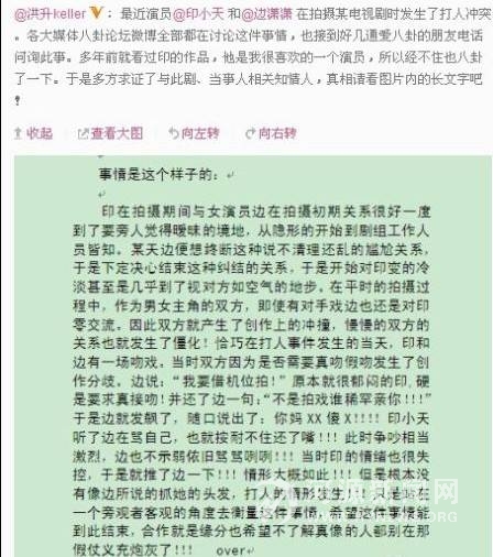 印小天打人事件一段现场视频曝光仍旧未能令此风波熄火,双方僵持的各执一词和模糊的视频画面对观众来说依然“真相”未明。2月27日下午,一位认证为知名经纪人的网友“洪升keller”微博爆出“印边两人曾一度暧昧,想结束尴尬关系的边潇潇冷对印小天”,当天两人的创作分歧竟是“吻戏是否需要真吻”。这一版本甫出,网友直叹“生活永远比戏剧精彩!”