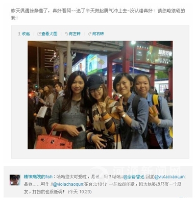 “昨天偶遇徐静蕾了,真好看阿~~追了半天鼓起勇气冲上去~没认错真好!”20日,内地网友“violachaoqun”在网上贴出一张与徐静蕾的合影,开心地记录自己在台北和徐静蕾的偶遇。“在台北101(大厦),一开始很怀疑,因为她旁边只有一个朋友,打扮的也很低调。”未想惹得其他网友好奇询问“是他吗?” 暗指徐静蕾绯闻男友台湾歌手黄立行。虽然“violachaoqun”最后说明了老徐身边的友人是位女性,但因老徐最近半年多次被游客曝出与黄立行同游台湾,此次还是引来网友的猜测——“老徐是不是又上台湾探亲去了?”