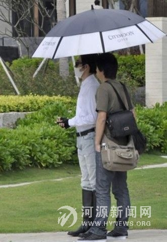 俞灏明怕晒戴墨镜口罩打遮阳伞 三亚海边拍宣传片