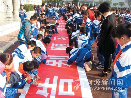 市三小的学生们在“告别陋习,规范言行,做个文明河源人”的横幅上签名。近日,市三小开展以“养成良好日常行为习惯、争做客家古邑文明人”为主题的千人签名活动,动员全校学生规范言行,做文明河源人。