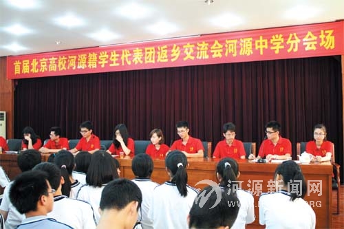 代表正在与河源中学学生交流。为鼓励更多学生努力学习,报效祖国,近日,河源市教育局、河源市政府驻京联络处、北京河源客家联谊会、北京河源大学生联谊会主办了首届北京高校河源籍学生代表团返乡交流会。来自北京地区不同高校的9 名河源籍优秀学生代表向家乡的高中学子们介绍了北京名校的情况及其高中时的学习经验,受到广大师生的好评。据悉,在京河源籍学子们本次要在我市各县区进行巡回交流。