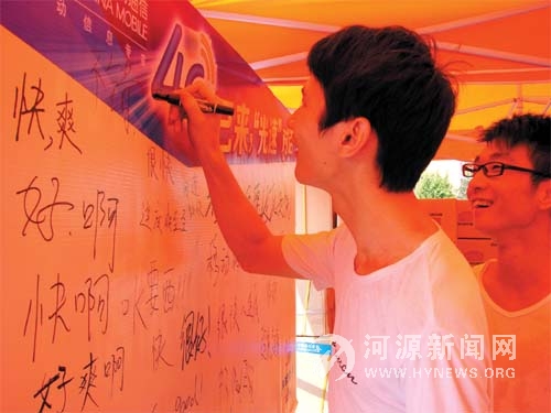 “这就是传闻已久的4G,真快”、“这就是传说的光速”,在河源移动4G 体验区,记者不时听到学子们的赞叹声。一些学生还在“4G 已来,光速对话”留言板上写下了自己的体验感想和期待。4G 到底有多快?据河源移动工作人员现场实测,TD-LTE 最高下载速度超过100Mbps,是3G 网络最高速率的4—5 倍,下载一部容量2G 大小的电影只需3—4 分钟,且用户体验时延小于0.1秒。