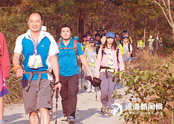 昨日,“青山秀水寻梦九连”2014 磨房河源第5 届40KM 徒步活动在连平县举行。活动吸引了来自广州、深圳、惠州、江西及河源本地的6000 余名徒步爱好者参与,他们从连平县内莞镇圣迹苍岩景区出发,一路领略连平的青山秀水,穿越 42 公里,最终到达连平县油溪镇政府。据介绍,本次参与人数是我市历年来徒步活动参与最多的一次,活动开展5 年来深受广大户外运动者的爱好。