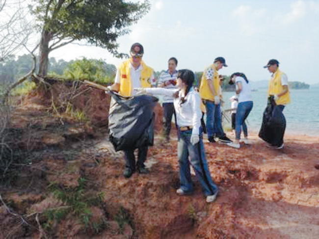 日前,广东狮子会第十四分区全部服务队 联合东源县万绿湖旅游发展有限公司志愿者, 一起开展了“万绿湖环保行”活动,以“善待万 绿湖,珍惜水资源”为主题,清理了万绿湖观音 山沙滩、龙凤岛背后的罗塘荒岛上及航线周围 的垃圾。他们也呼吁市民能自觉爱护环境,提 高环保意识,不要再往万绿湖扔垃圾,保护好 我们的水资源。