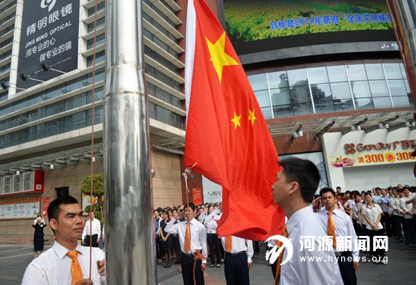 昨天上午,市区一商场大楼门前气氛热烈,数百名员工集合在门前广场举行了庄严而隆重的迎国庆、升国旗仪式,庆祝中华人民共和国成立65 周年。据介绍,举行升旗仪式是对员工的一次爱国主义教育活动。当日,记者在市区看到不少街道都悬挂了国旗,气氛浓厚。