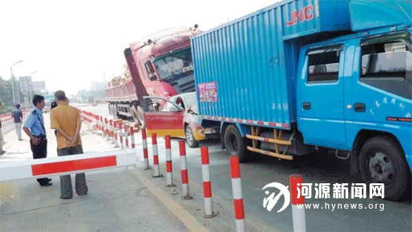 17 日中午12 时许,一辆小轿车在源城区高埔收费站前被一辆满载货物的大货车追尾,由于惯性的作用,小轿车又撞上了前面的一辆货车。源城警方接报后,迅速赶往现场,所幸车主没有大碍。随后,交警部门赶往现场进行处置。目前,事故原因正在进一步调查中。