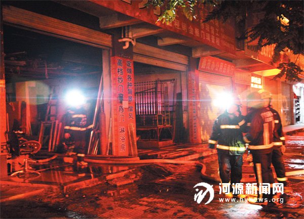 消防人员正在清理起火现场。19 日晚11 时许,市区永福路市二中对面一门窗加工门店发生火灾,据现场源城文昌消防中队救援官兵介绍,起火原因是门店内一阁楼有住人,电脑发热引起短路造成火灾,所幸当时人员撤离及时,并未造成人员伤亡,消防官兵及时将明火扑灭,该路段部分门店通讯电缆被烧毁。当晚,此门店被现场责令停业整改。