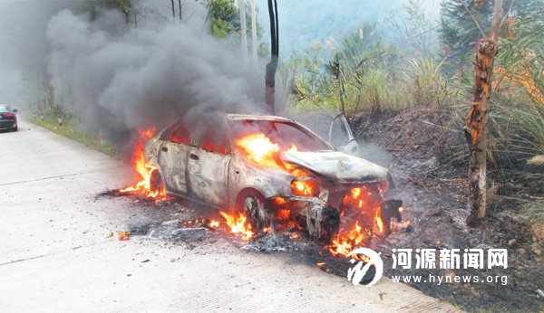 前日16 时许,和平县热水路口一辆行驶中的小车突然自燃,熊熊大火引燃旁边树林。和平消防中队接报后迅速赶往现场救援。20分钟后,火被及时扑灭,未造成重大损失。消防官兵经过询问车主得知,小车是因高速行驶轮胎过热导致火灾发生。