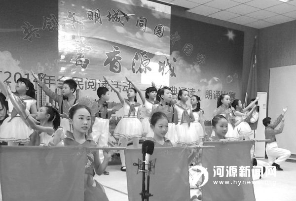 日前,源城区2014 年全民阅读活动—— “经典诵读”朗诵比赛在源城区下角小学举行,该区27 所中小学参加了本次比赛。源城区图书馆还现场免费发放借书证1100 张,让小读者了解图书馆,走进图书馆,掀起热爱阅读的热潮。据介绍,本次活动旨在通过全民阅读,大力提倡以读书为乐的良好社会风尚,发动全区中小学生积极参与,传承传统文化经典,弘扬民族文化精华,从而推动我市创建全国文明城市工作深入开展。