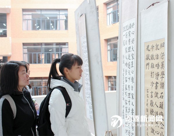为给大学生提供一个交流客家文化的平台,营造浓厚的校园艺术氛围,日前,河职院举办以“诵客家谚语做文明市民”为主题的书画作品展,共展出画作23 幅和书法作品11 幅,内容则以表现客家文化风貌和客家人勤劳朴实的美德为主。