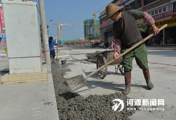施工人员对马路边与人行道进行最后的填补。前日,记者在新风北路市政工程——纬十一路至纬十二路路段看到,目前该路段的路面已基本完工,施工人员正进行收尾施工。据了解,新风北路市政工程纬十一路至纬十二路这段 380 米左右路段,由原来的6 米宽扩宽到现在12 米,该路段完工后,将给公园西小学师生和附近居民出行带来很大方便,预计本月底轻型车辆可以通行。