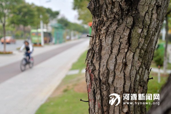 日前,有市民向记者反映,市区客家文化公园南门前一排数十棵香樟树上布满了密密麻麻的铁钉,不仅影响树木生长,存在安全隐患,而且也很不美观。记者从公园管理处了解到,这些铁钉应该是当初栽树时,为了支撑树木,搭支架时钉在树上的,之后支架被拆走,却留下了铁钉。该公园管理人员表示,近日会组织人力进行全面清理。