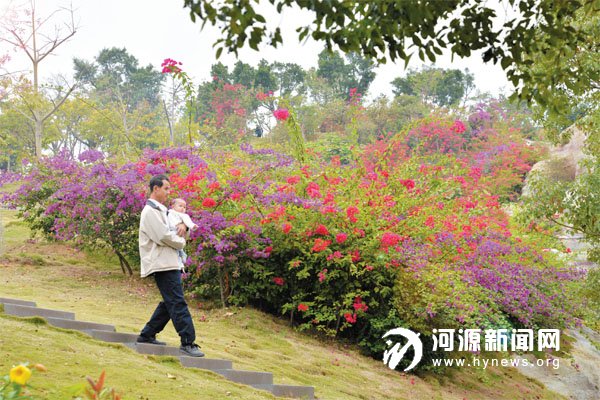 市客家文化公园里的勒杜鹃(三角梅)在阳光照耀下显得特别艳丽,呈现出“龙头山上红一角”的美景。客家文化公园的“河之源”瀑布于今年元旦正式开放,成为该公园一道靓丽风景,为打造好这个景观,城管部门在瀑布山顶及山坡上种植了勒杜鹃,呈现出“河源之水天上来,龙头山上红一角”的靓丽景观。近日天气晴好,五颜六色的勒杜鹃花开正艳,市民若到该公园赏花,亦不失为冬日一乐。