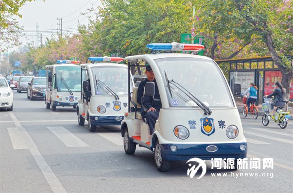 昨日上午,源城警方首次使用警用电动巡逻车在辖区街面巡逻。据介绍,这种电动巡逻车造型新颖、美观、低噪声、无污染,使用时不仅节约能源而且其小巧轻灵的车身方便民警直接面对面地与群众交流,具有独特的亲和力。电动巡逻车还配备警灯、喊话器等,最高时速达40km/h,一次充电可行驶80公里。