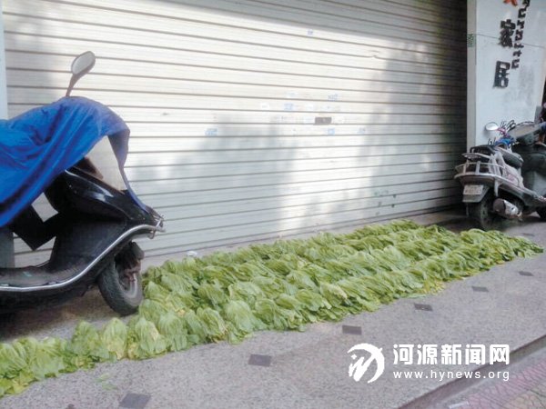 昨日上午,记者在市区红星路某店铺门口,看到大堆的青菜被晾晒在了地上,据目测,过道被占用了一大半,晾晒青菜两头停放着两辆女装摩托车。附近市民表示,青菜晾晒在过道上,影响大家通行,而且也不卫生。