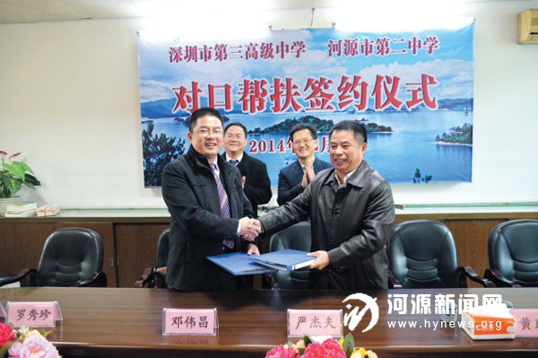 12 月5 日,深圳市第三高级中学与河源市第二中学对口帮扶签约仪式在市二中举行。仪式上,深圳市第三高级中学为市二中捐赠了一批教育书籍和1 万元现金,并签订了合作协议。据了解,此次活动是《深圳市教育局与河源市教育局开展结对帮扶框架协议》里的其中一项,市二中成为首所落实深圳市教育局直属学校与河源市教育局直属学校结对帮扶的学校。仪式结束后,两校就进一步的合作细节等,进行了互动交流。