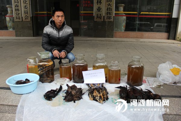 12 月4 日,市公安局森林分局民警会同市野保办工作人员对全市酒楼、市场开展清查行动中,再次破获一宗非法出售珍贵、濒危野生动物及其制品案。在市区一家农贸中心市场检查时,该局民警发现一档口有疑似野生动物泡酒7 瓶。经技术人员鉴定,这批泡酒中有褐翅鸦鹃6只、隼形目鹰科的白腹隼雕1 只和隼形目鹰科的乌雕1只,均属于国家二级保护动物;金环蛇1 条和眼镜王蛇8 条,属于国家“三有”保护动物。目前,涉案人员曾某鸿因涉嫌非法出售珍贵、濒危野生动物及其制品罪被刑事拘留。