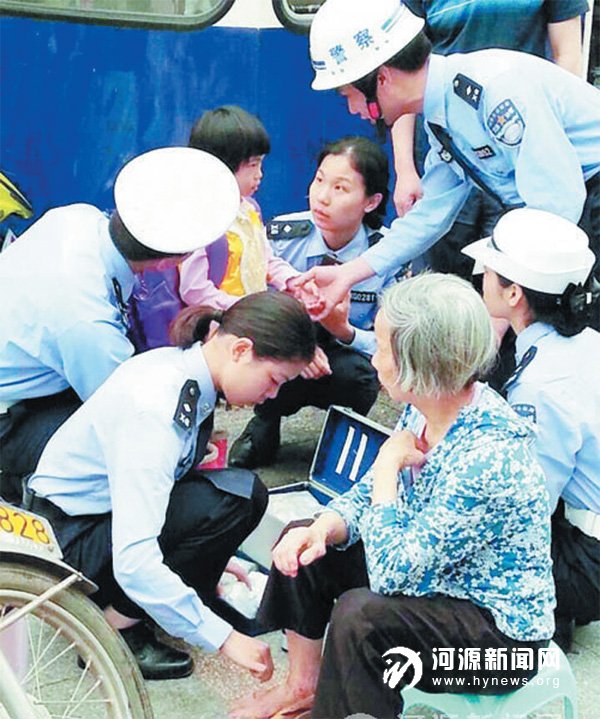当时,正值上班车流高峰期,刚从指挥岗亭轮岗下来的中队指导员罗莉娟立即叫来队员肖飞燕协助,将受伤的老人扶到岗亭边坐下。她一边安慰老人,一边让从部队卫生兵退伍回来的肖飞燕进行现场急救。肖飞燕立即为老人进行伤口消毒和包扎止血。很快,老人家属也赶到现场,看到老人身体并无大碍,也得到民警的及时救治,对女警们的及时相助表示感谢。