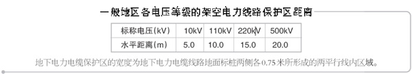 法规:《电力设施保护条例》第十条规定,架空电力线路保护区是指导线边线向外侧水平延伸并垂直于地面所形成的两平行面内的区域,在一般地区各级电压导线的边线延伸距离。