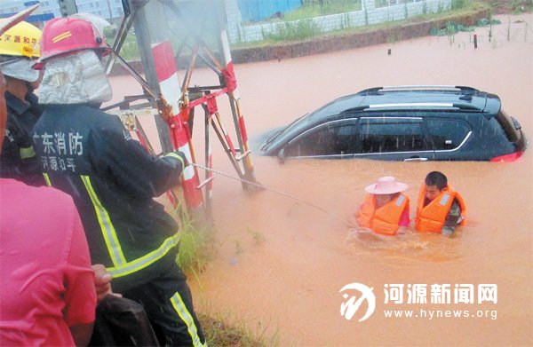 由于近期时有骤雨,和平县多地发生内涝,低洼路段被淹,日前,和平消防中队接到求助,和平县城工业园凤尾工厂附近有人被洪水包围,情况危急。消防官兵赶到现场后,只见一对夫妇和一辆SUV 被困水中。根据现场情况,消防官兵涉水救援。在做好安全防护措施后,经过近半小时的救援,消防官兵成功将这对夫妇带离危险地段,并送其安全回家。