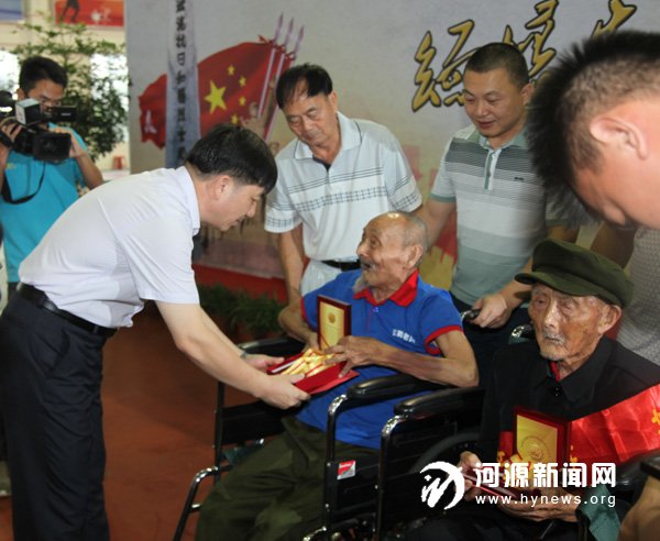 专题展演活动中,和平县委副书记、县长陈劲松向抗战老兵黄胜庸、宋顺祥送上了“中国人民抗日战争胜利70 周年”纪念章,以及一次性生活补助费。