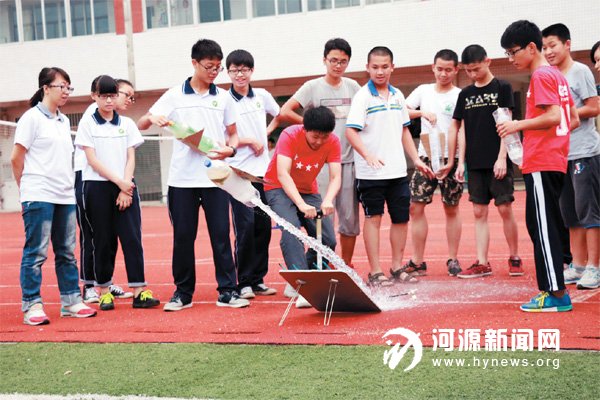 正值暑假,连日来,源城区文昌中学里却欢声笑语不断。原来是华南师范大学物电学院团学服务队的大学生们正在该校开展“三下乡”活动。据介绍,本次“三下乡”共有25 名大学生,支教除了写作、英语和数学等课程外,还开展了物理实验、科技制作、话剧、音乐鉴赏、趣味运动会等丰富多彩的活动,吸引该校70 多名中学生回校学习。图为学生们在制作和发射水火箭。