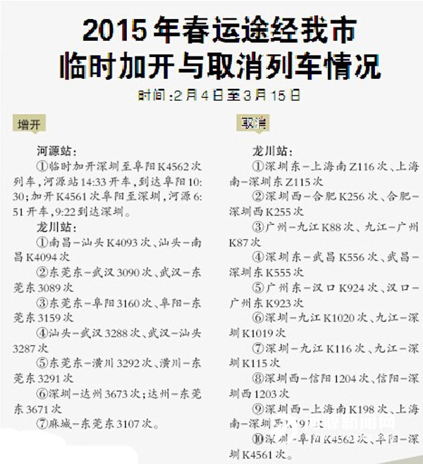 据了解,自2 月4 日起,河源站、龙川站共加开8 对临客列车。同时,此前途经我市的昆明至厦门高崎的K232\K231、广州东至厦门高崎的K300\K299 自2 月4 日起,始发、终到站由厦门高崎改为厦门站;途经我市、往返于深圳—南京的K26\25 次列车将不再停靠和平站;原先停靠河源、龙川两站的K256\ 255、K88\87、K556\555、K924\923、1204\ 1203 次列车春运将不停靠龙川站。火车站工作人员提醒,由于春运期间部分列车有所变动,旅客出行前要提前了解列车发车时间,以免耽误行程。