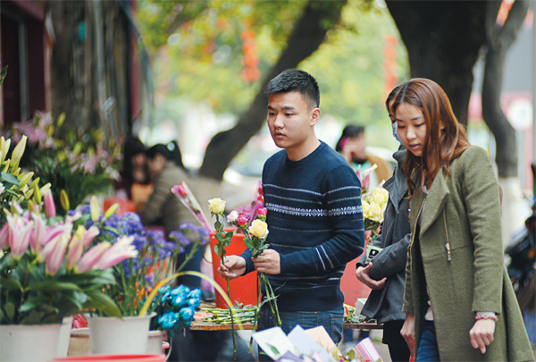 昨日上午,记者走访市区部分花店了解到,今年妇女节市区花市遇冷,价格普遍略涨。记者在老城公园路口的几家花店看到,陆陆续续有一些零散的客人前来购花。据部分店主介绍,今年单位、公司订花严重减少,价格较去年略有上涨,大束花在50-300 元之间,购花群体主要以家庭和年轻人为主。图为一对年轻男女在选购心仪鲜花。