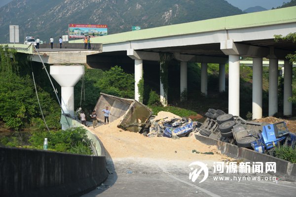 突然,第4 辆重型货车从高速公路驶下进入匝道。陈方友和唐洪文拼命挥舞着手中的电筒,并高喊:“不要来了!不要来了……”但这辆重型货车司机似乎没有听到,仍然继续往前开,行驶到断口处,司机发现时已经来不及了,整辆车掉了下去。“车头向下,撞到底下的桥面后发出巨响,还冒出火花……”陈方友回忆起当时的情景,神情仍十分紧张。