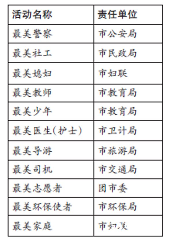 为进一步培育和践行社会主义核心价值观,充分发挥典型的示范引领作用,提升公民思想道德建设水平,市文明委在全市开展十大“最美人物”评选活动,分别是:最美警察、最美社工、最美媳妇、最美教师、最美少年、最美医生(护士)、最美导游、最美司机、最美志愿者、最美环保使者、最美家庭,每类各评选10个人。活动得到广大干部群众的积极参与,市民李先生说,“网站、报纸上公布的一些最美候选人,有好几个我都熟悉,他们的事迹确实非常感人,我都给他们投了票。”