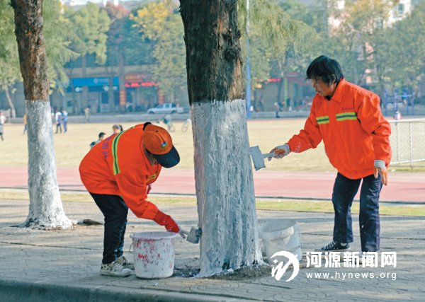 为预防病虫害,确保冬季绿化树木温暖过冬,昨日,园林部门组织人员为城区道路绿化树木进行消毒刷石灰工作(如图)。据了解,冬季树木刷石灰浆,不仅可以防冻,粉刷后还可以反射太阳光,降低树干昼夜温差,减轻树木冻害。同时,在石灰浆加入相应药液,可以起到杀虫杀菌作用,防止树木病虫害,确保绿化树木成活率。