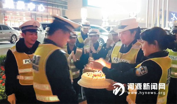 前天晚上,市区坚基商业中心广场,当众多市民聚在一起准备倒数跨年时,在现场执勤的市交警支队江北大队女子中队也上演了温情一幕。当晚,还没休完婚假的队员邱友泉赶回来执勤了,执勤中中队长池静得知邱友泉是1 日生日,就悄悄找人准备了蛋糕并点上蜡烛送到他面前,场面温馨动人,现场不少市民也被这一幕感动,纷纷送上祝福。