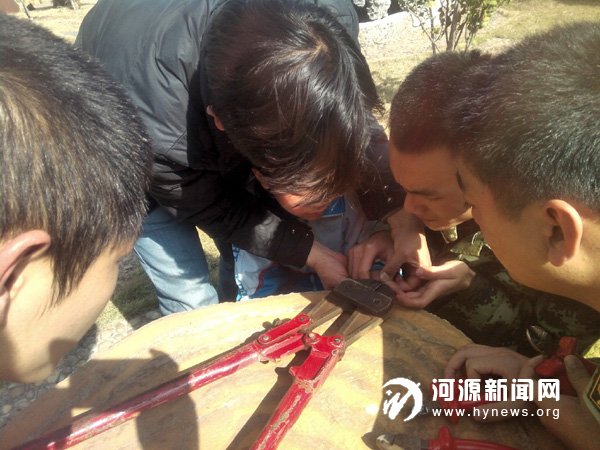 1 月19 日中午1 时45 分,两位家长焦急地带着小孩来到龙川县消防中队寻求帮助。原来,他们的孩子因为一时贪玩将钢圈套在了自己的手指上,原以为可以轻易取下,却不想尝试数次也没有成功取下,还导致手指红肿。经过对小孩被卡手指的仔细观察,一名消防战士与小孩聊天,安抚他紧张的心理,转移他的注意力;另一名战士紧紧搂住孩子,将被卡的手扶好,固定在桌上,防止处置过程中孩子因为疼痛而移动,造成二次受伤;另一人利用绝缘工具组对钢圈进行仔细剪切破拆,10 分钟后,小孩手指上的钢圈被成功摘除。