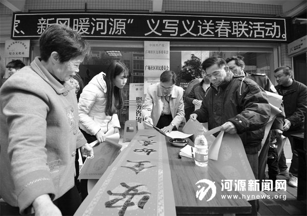 昨日下午,在省培育和践行社会主义核心价值观示范点源城区东埔街道广场社区,由市委宣传部、市文广新局、市文明办和市文联主办的2015 年 “春联送万家·新风暖河源”义写义送活动拉开序幕。当日,15 名市、区书法家走进社区,为广大市民义写义送春联。2 月4-10 日期间,我市将组织全市书法家志愿者走进乡镇街道社区及农村,现场为广大群众书写赠送道德春联;组织广大社会志愿者送道德春联进家庭,开展道德春联送困难户、送身边好人、送文明户等活动。