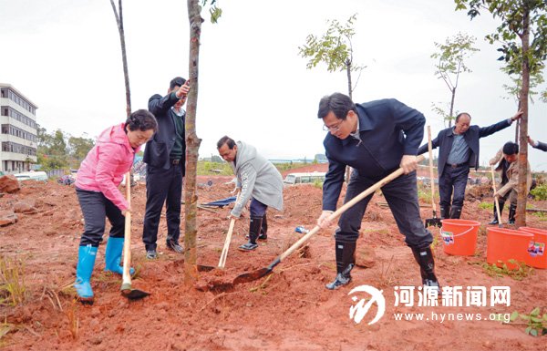 3 月12 日是植树节。昨日上午,市委书记何忠友率市委、市人大、市政府、市政协四套班子领导成员与市直、源城区100 多名机关干部、志愿者一起,来到一通汽车城附近的粤赣高速公路造林点参加义务植树,栽下一株株树苗,播种一片片新绿。
